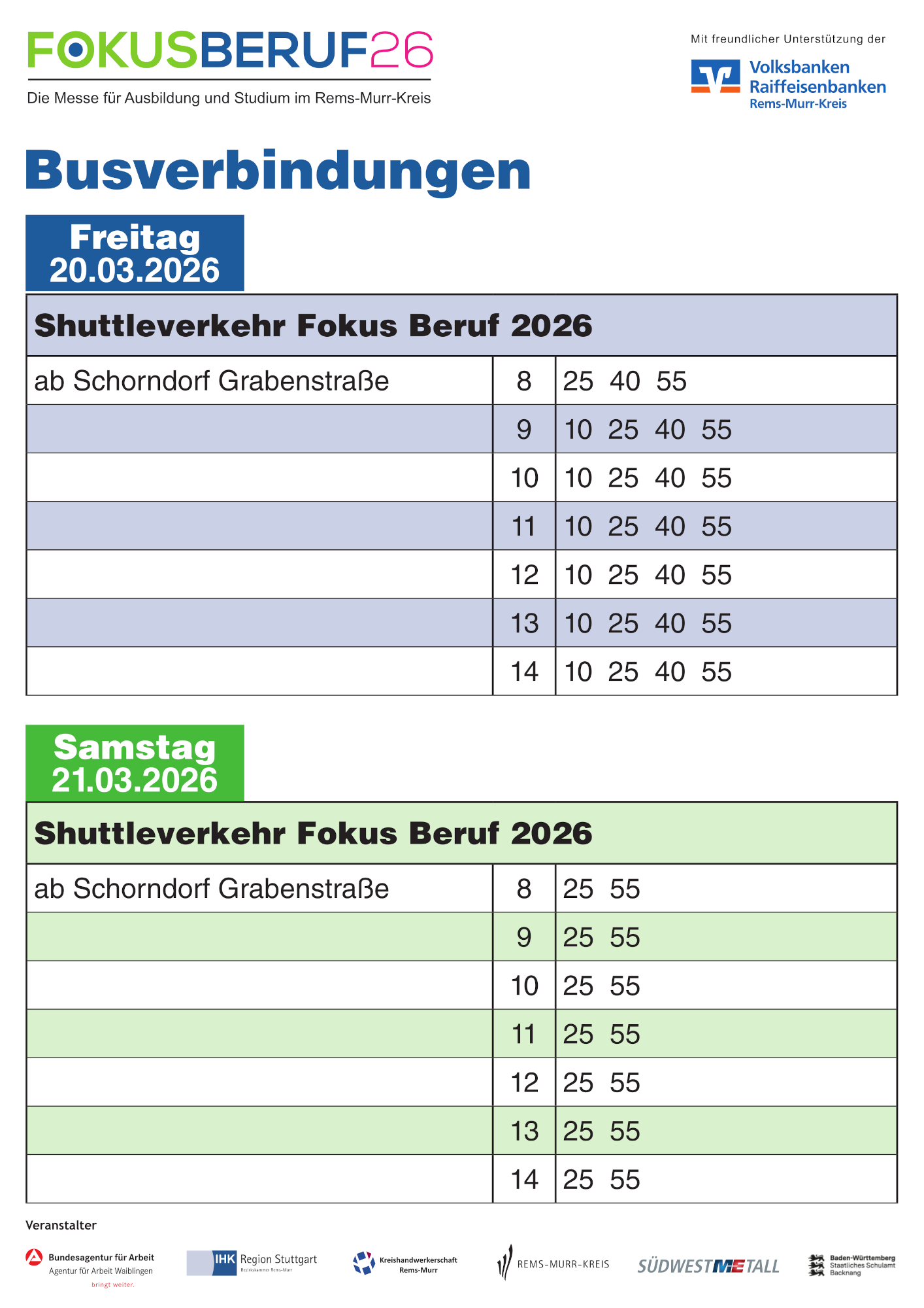 Fahrzeiten: Freitag, 20.03.2026, 8:25 bis 14:55 Uhr, Samstag, 21.03.2026, 8:25 bis 14:55 Uhr, Abfahrt freitags alle 15 Minuten und samstags alle 30 Minuten